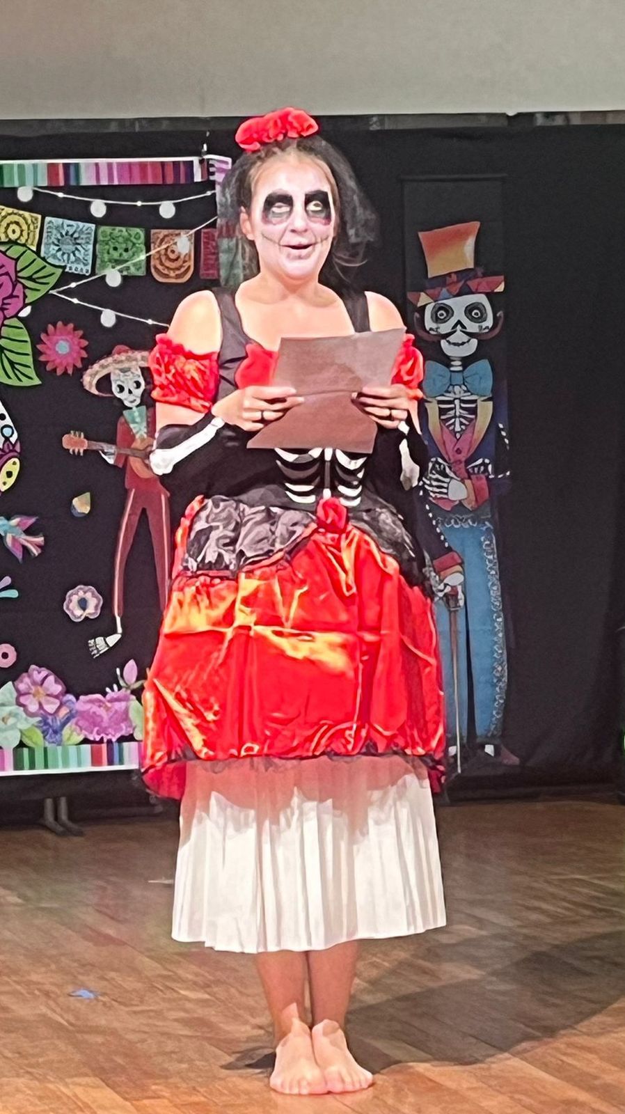 Le vendredi 31 novembre, nos 38 participants se sont réunis de 15h à 18h pour une répétition générale, un goûter partagé, une session maquillage et une préparation collective, avant d’accueillir un premier public à 18h puis un second à 18h30. Une centaine de spectateurs se sont déplacés pour l’occasion avant d’entamer ou de continuer leur tournée de bonbon dans les rues de Bonnelles.