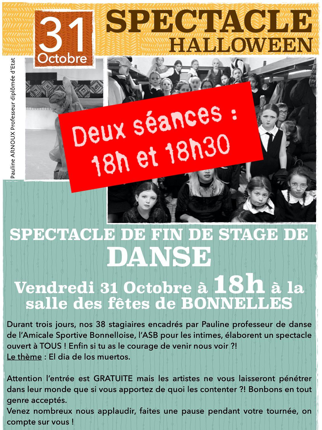 La 5ème édition du stage de danse d’Halloween organisé par l’Amicale Sportive Bonnelloise a eu lieu pendant les vacances de la Toussaint à la salle des fêtes de Bonnelles. Quatre jours de stage intensif mardi 28, mercredi 29, jeudi 30 et vendredi 31 novembre, ouvert à tous, adhérents ou non, bonnellois(e)s et communes avoisinantes, pour vous présenter deux spectacles de 30 minutes au terme du stage, sur le thème : El dia de los muertos.