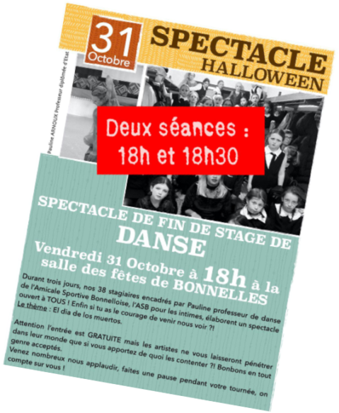 La 5ème édition du stage de danse d’Halloween organisé par l’Amicale Sportive Bonnelloise a eu lieu pendant les vacances de la Toussaint à la salle des fêtes de Bonnelles. Quatre jours de stage intensif mardi 28, mercredi 29, jeudi 30 et vendredi 31 novembre, ouvert à tous, adhérents ou non, bonnellois(e)s et communes avoisinantes, pour vous présenter deux spectacles de 30 minutes au terme du stage, sur le thème : El dia de los muertos.